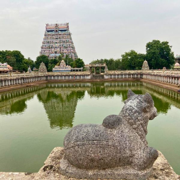 Nous poursuivrons notre journée en direction de Gangaikonda Cholapuram, un temple dédié à Shiva, édifié par le fils du roi Rajaraja Chola pour commémorer la victoire de son père sur les royaumes voisins. Niché dans un environnement verdoyant, ce site est un joyau de l’architecture Chola et figure au patrimoine mondial de l’UNESCO.