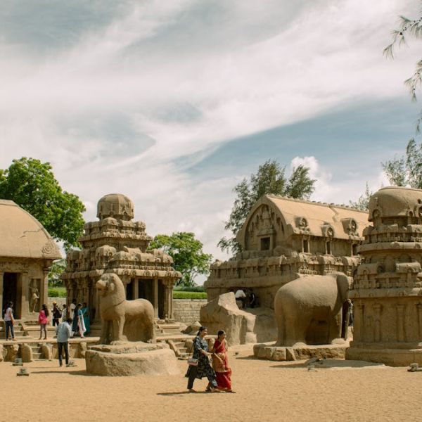 Nous commencerons notre visite par les célèbres Cinq Rathas, un ensemble de cinq temples monolithiques taillés chacun dans un seul bloc de pierre. Chaque Ratha (char en sanskrit) est dédié à une divinité et porte le nom d’un héros du Mahabharata. Ce lieu est un chef-d’œuvre d’ingéniosité architecturale.