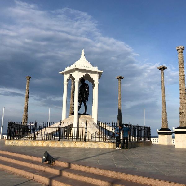 Une pause bien méritée nous attend au parc Bharathi, véritable havre de paix, avant de flâner dans la ville blanche. Les rues, tranquilles et bordées de bâtiments néo-classiques, dévoilent un charme intemporel. Nous emprunterons la Promenade, une avenue piétonne bordée de palmiers, fermée à la circulation et surplombant le front de mer. C’est un lieu privilégié où locaux et visiteurs se retrouvent, avec en son centre la majestueuse statue de Gandhi, symbole de la paix et de la lutte pour l’indépendance.